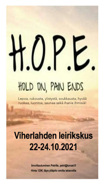 Lokakuun lepoviikonloppu järjestetään 22.-24.10.2021 Viherlahden leirikeskuksessa Merimaskussa. Viikonlopun hinta on 120e, mihin sisältyy ruokailut ja majoitus (omat lakanat tarvitaan). Aloitamme perjantai-iltana klo 18 ja päätämme viikonlopun sunnuntaina klo 13-14 aikoihin. Ilmoittautumiset Petri Hyrskylle sähköpostitse petri@turust.fi.