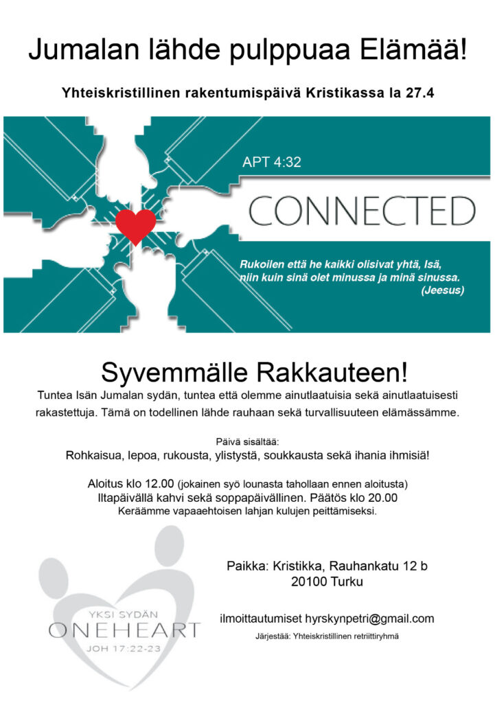 Olet lämpimästi tervetullut rakentumaan, lepäämään ja ylistämään yhdessä Turun Kristikalla lauantaina 27.4. Aloitamme klo 12 ja lopetamme klo 20 aikaan. Iltapäivällä on tarjolla kahvia sekä keittopäivällinen. Tilaisuudessa kerätään vapaaehtoinen lahja kulujen peittämiseksi.
